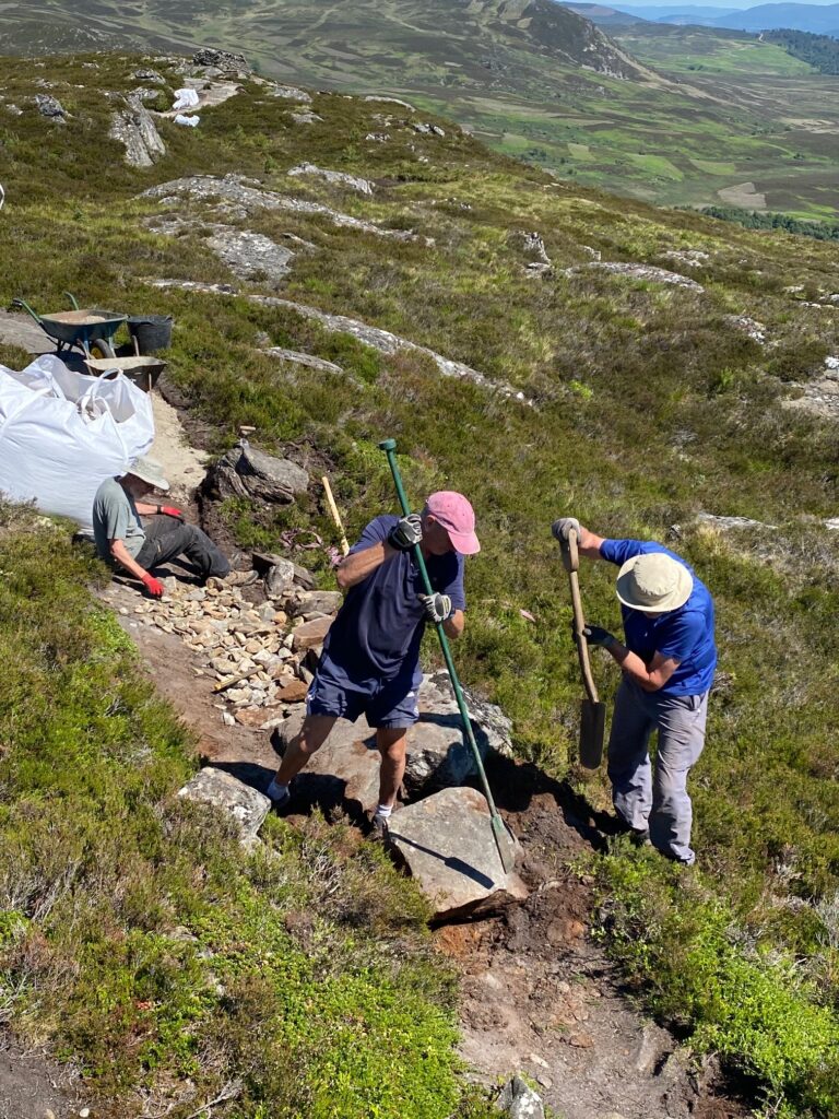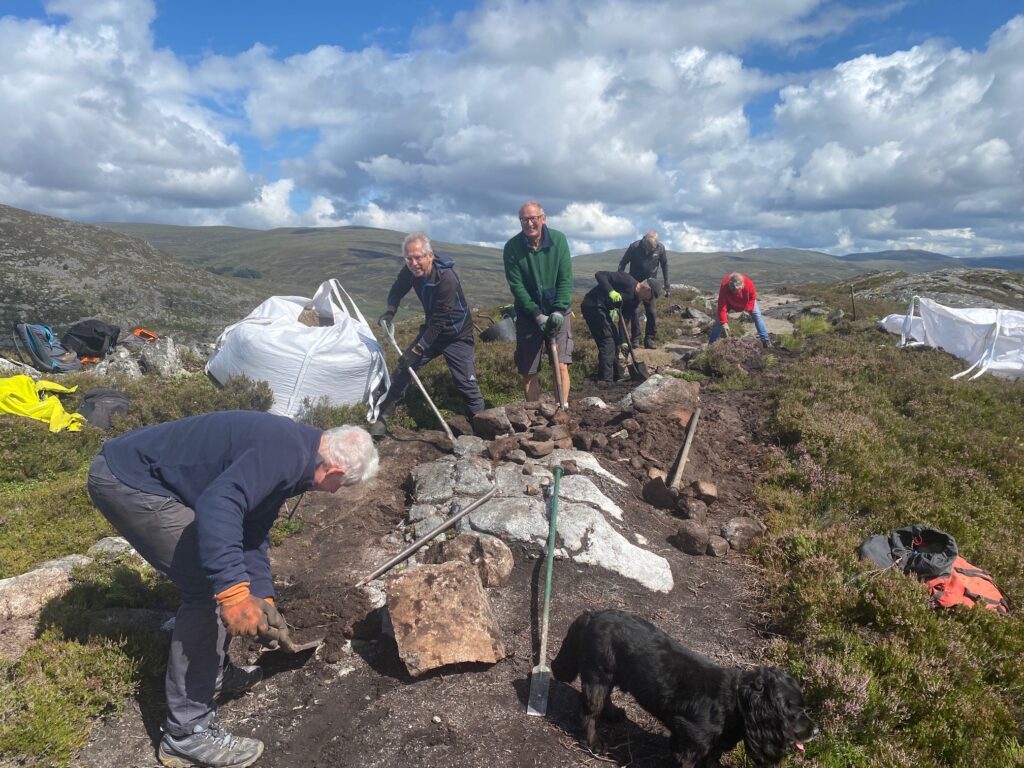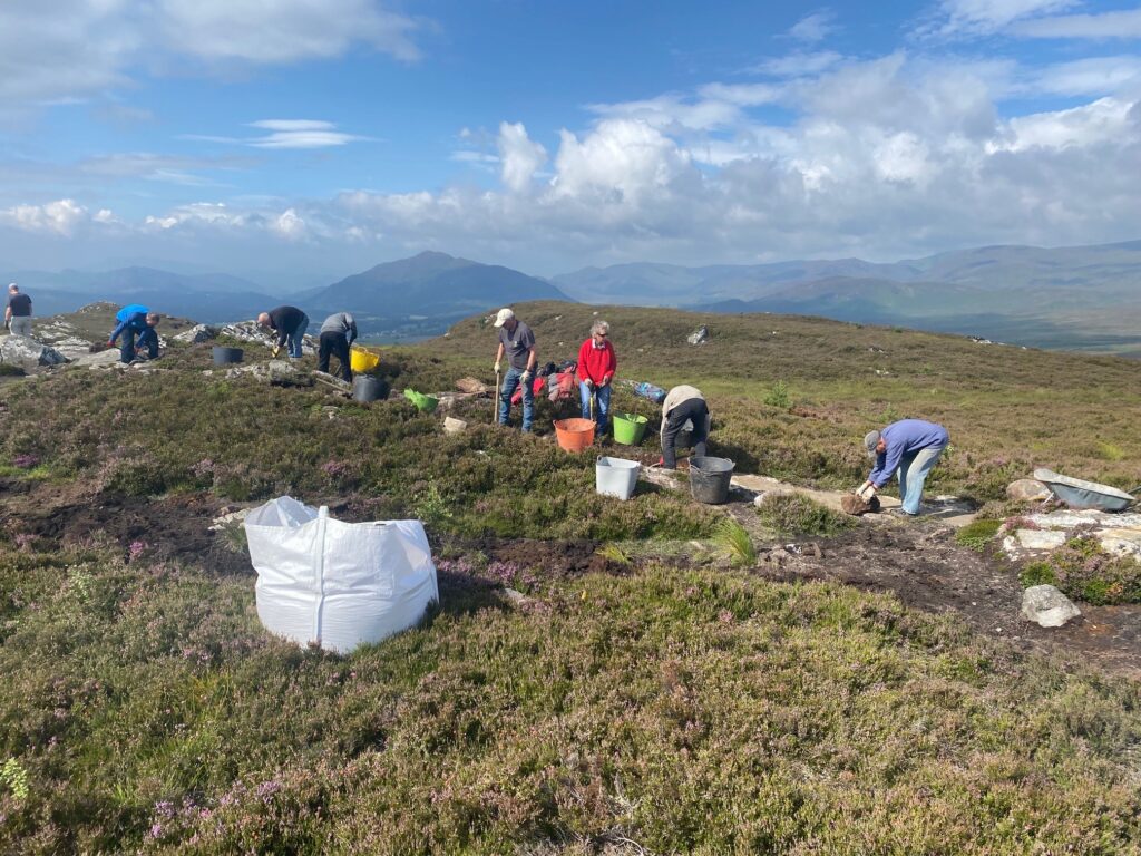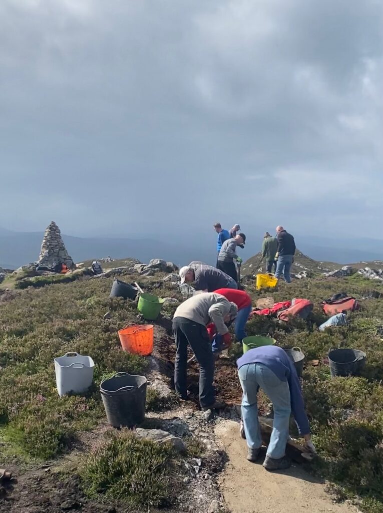 Since the helicopter lift of 100 tons of quarry dust up Creag Bheag on 19 May 2023 volunteers have completed the first two phases of path work across the summit – finishing on 20 July, several weeks ahead of schedule.