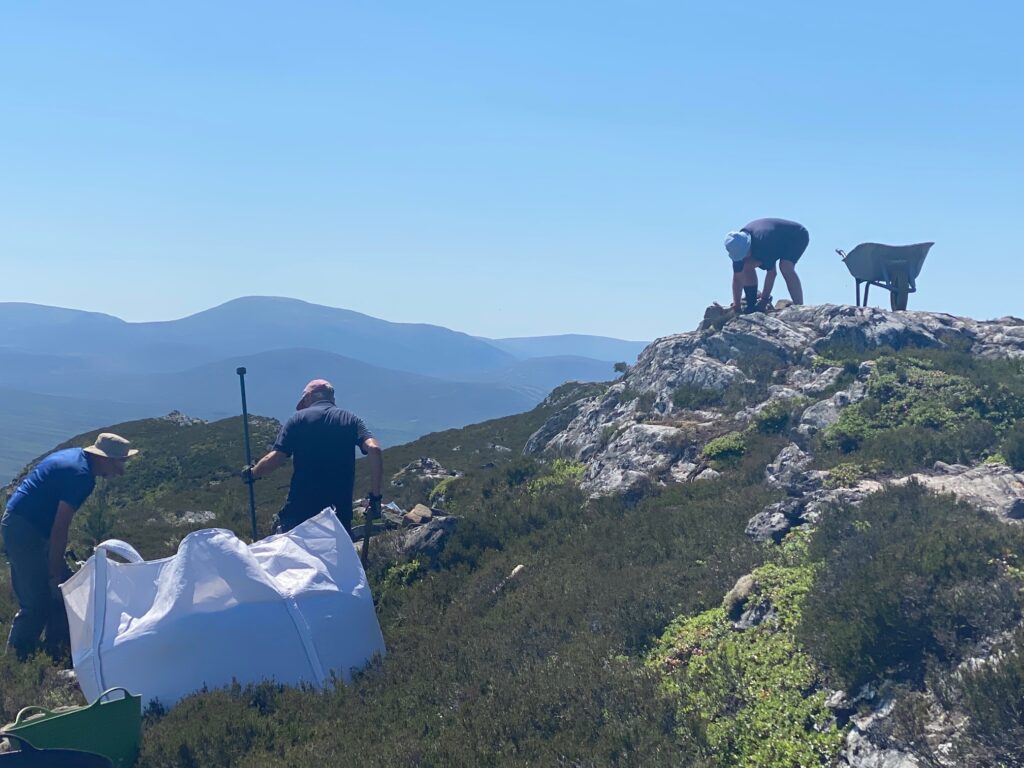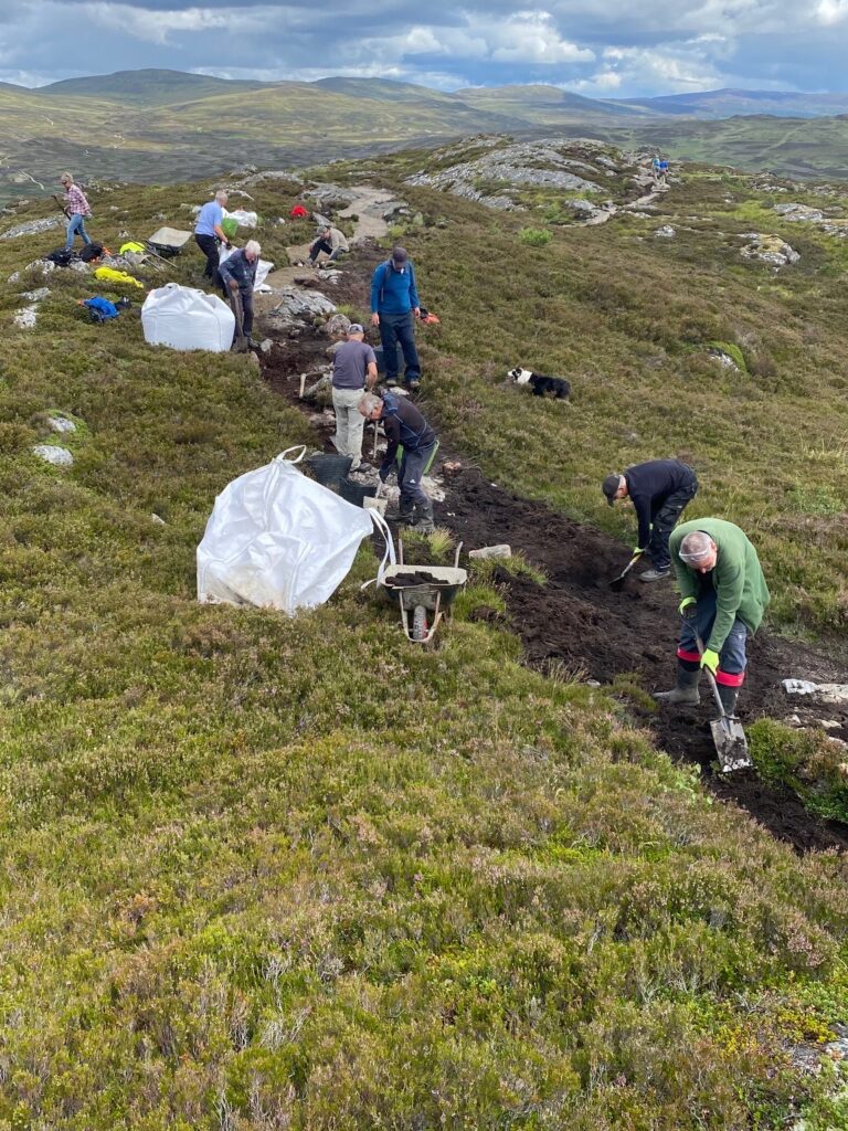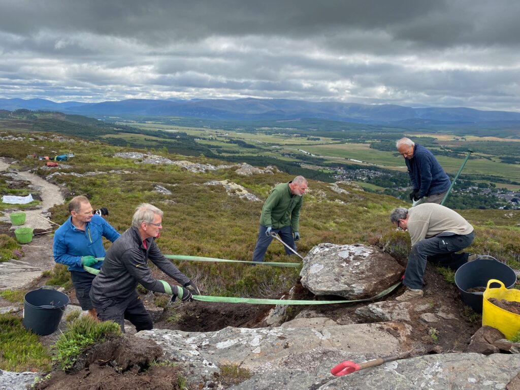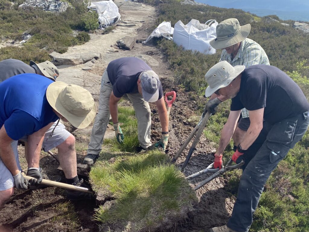 Since the helicopter lift of 100 tons of quarry dust up Creag Bheag on 19 May 2023 volunteers have completed the first two phases of path work across the summit – finishing on 20 July, several weeks ahead of schedule.