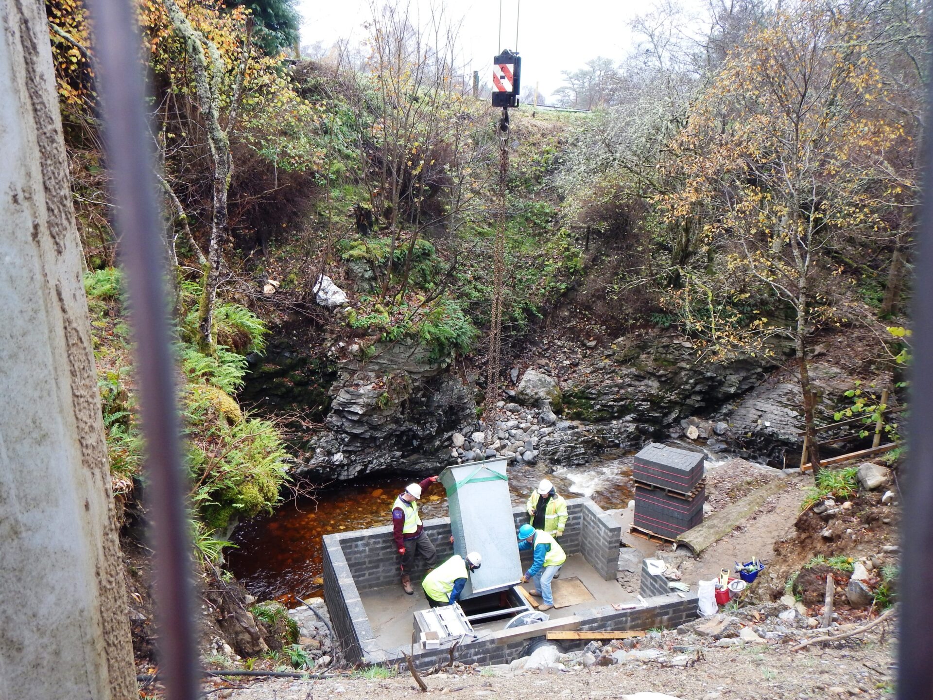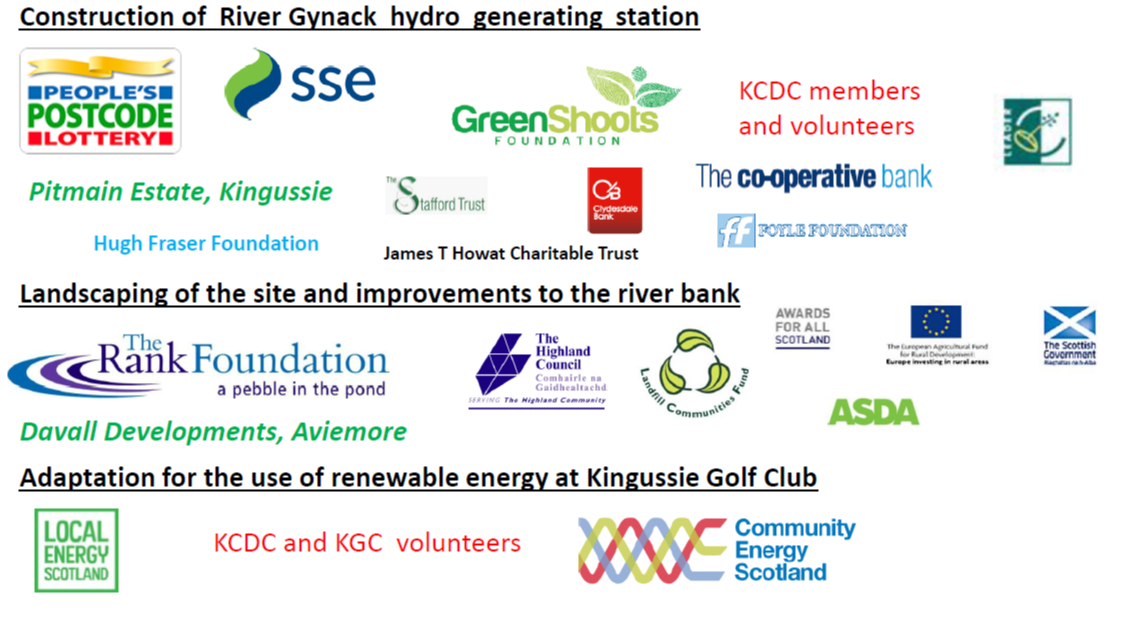 Starting in 2006, Kingussie Community Development Company (KCDC) worked to re-establish a run of the river hydro scheme that provided power to St Vincent’s hospital during the 1920s. The new scheme was commissioned in February 2015 and is connected to the Kingussie Golf Club. Surplus electricity is exported to the grid. The income from the new scheme is used to support community projects and initiatives
