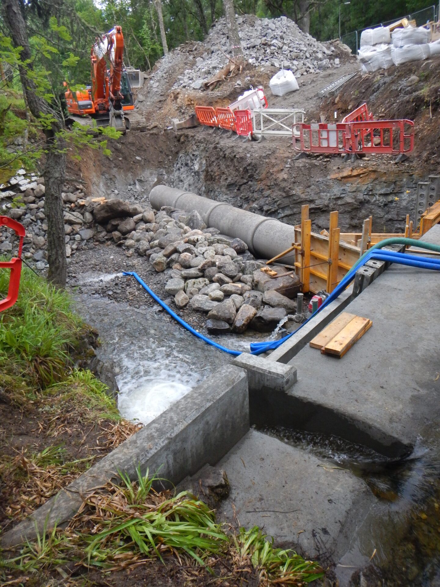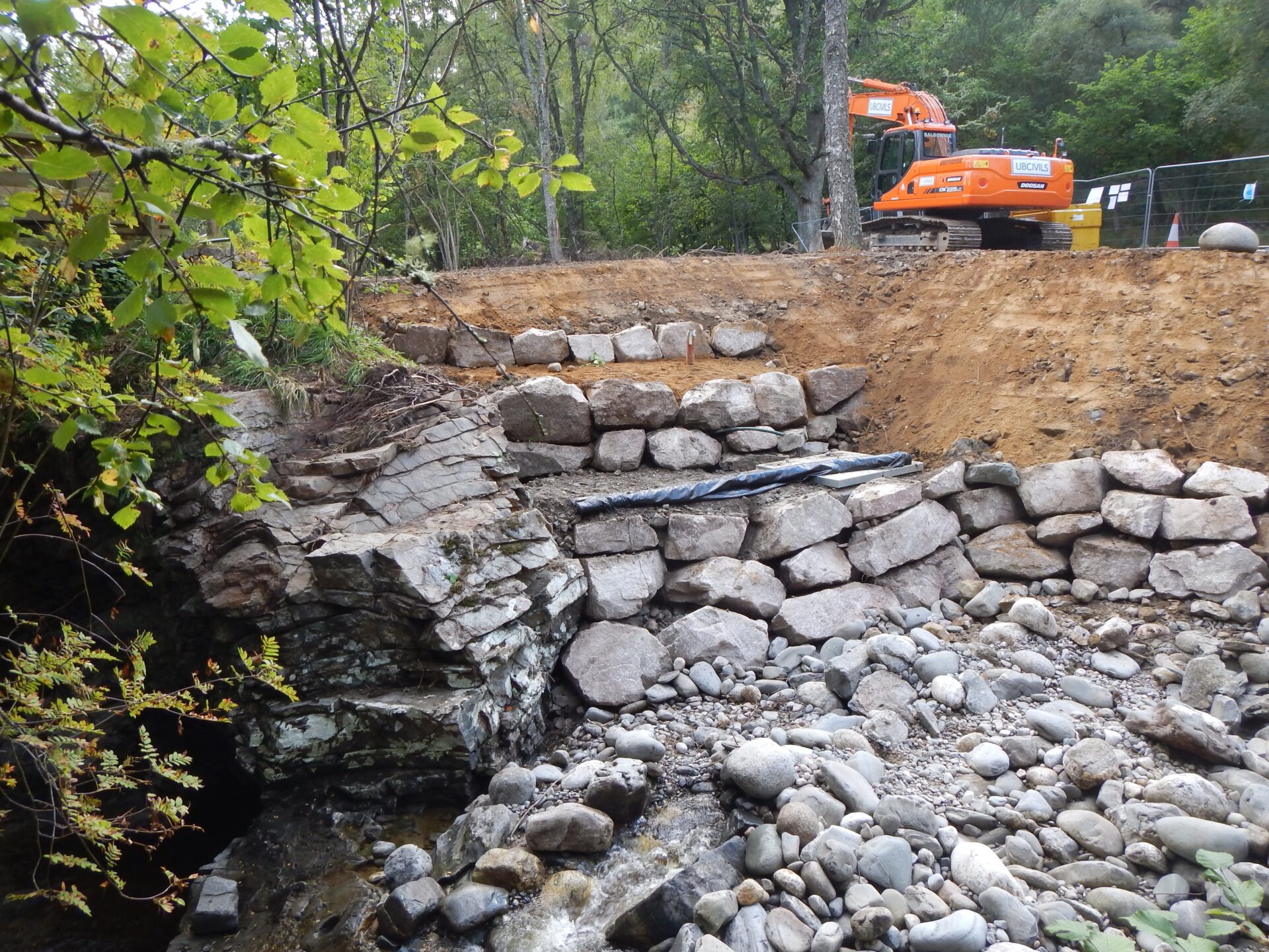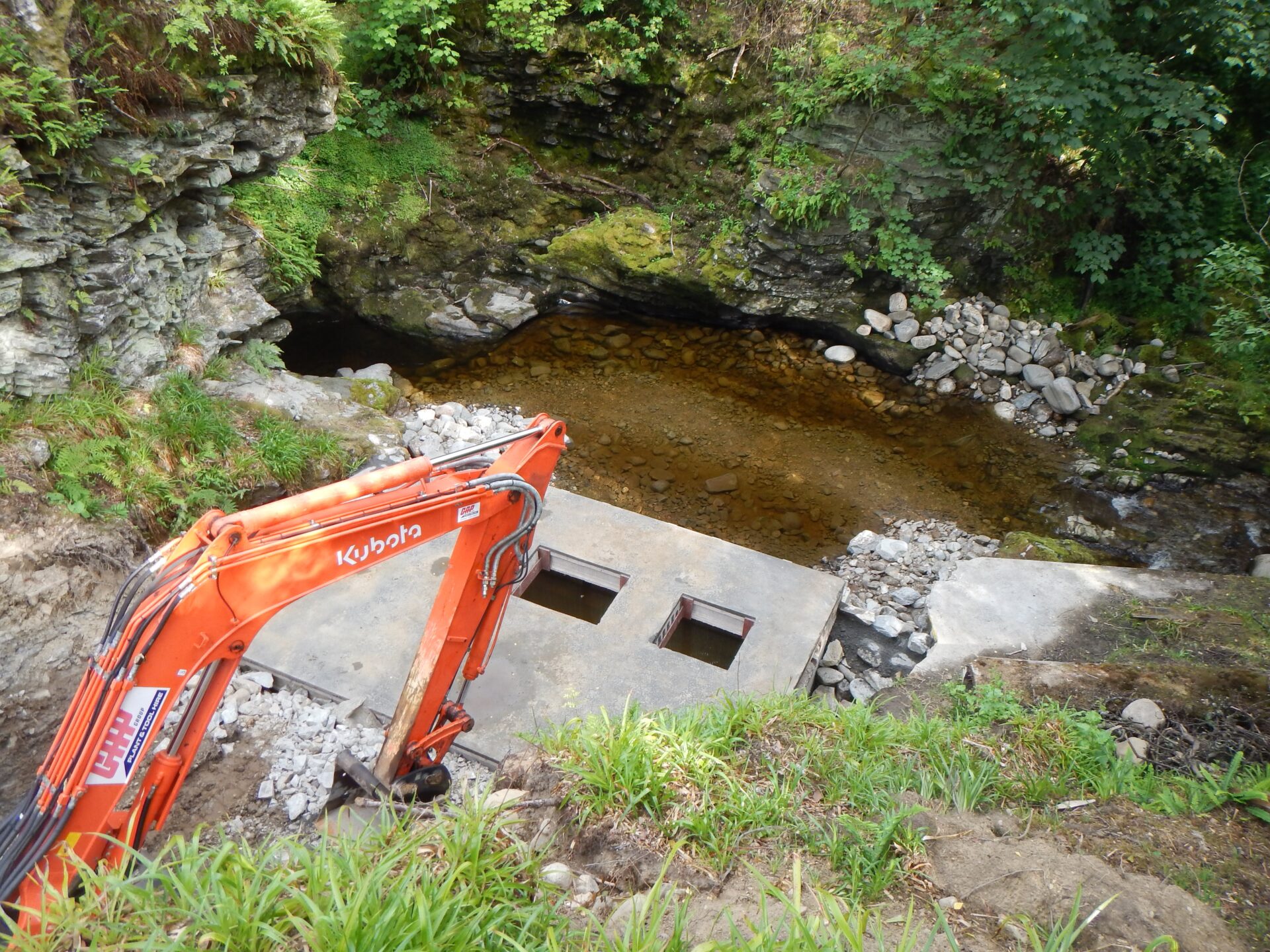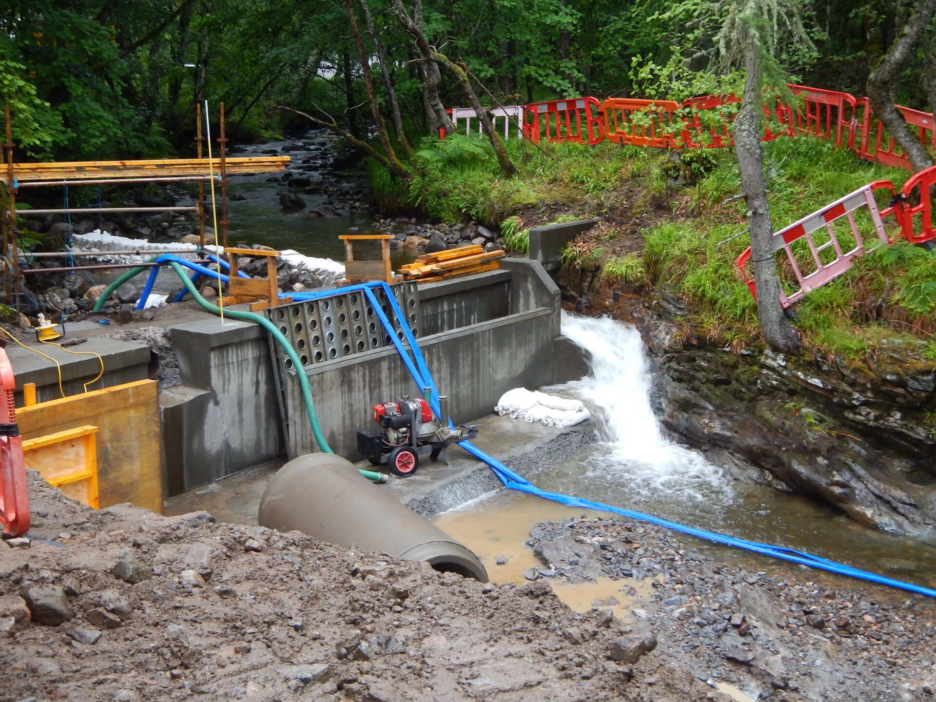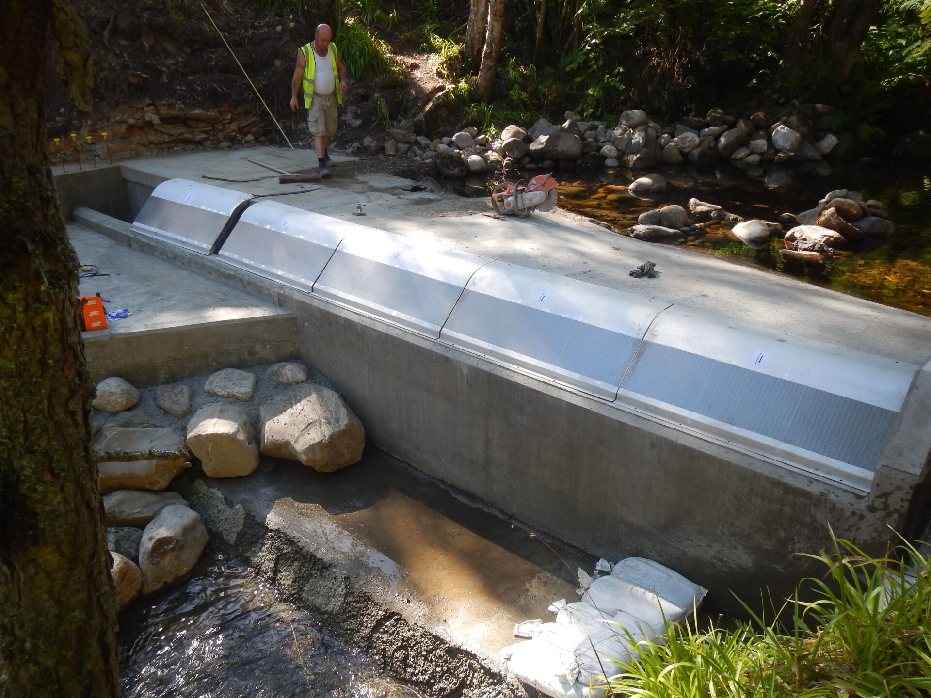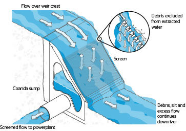 Water is abstracted through a 9m wide Coanda screen mounted on a new weir cast against the 1920s weir. The screen prevents entry of sediment and fish. There is a bypass channel on the East side of the weir to ensure that there is always a flow of water down the river.