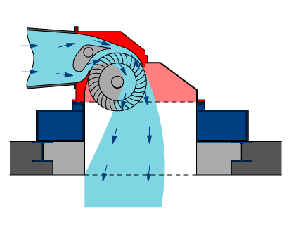 In the Crossflow type of turbine the water flows over and under the inlet vanes which direct flow to ensure that water hits the rotor at the correct angle for maximum efficiency. The water flows over the upper rotor blades, turning the rotor, then through the centre and back across the lower rotor blades producing further turning force. Most of the power is extracted by the upper blades (roughly 75%) and the remainder by the lower blades. The turbine is installed 1.5m above the summer water level and there is a rectangular draft tube below it that discharges 0.7m below the river level. As it leaves the rotor, water fills the draft tube from just below the rotor all of the way down to the discharge water level. This column of water wants to ‘fall out’ of the draft tube thus creating a negative pressure inside the turbine cavity and increasing the effective head of water available. The total head available is 3.8m. The turbine drives a 15kW generator which is connected to the electricity grid via Kingussie Golf Club, 250m to the north of the site.