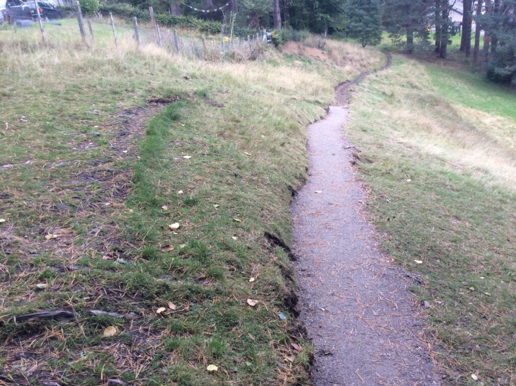 Currently we are improving the path in Ardvonie Park that leads from behind the toilets up to Taits Brae. With the permission of Highland Council (who own the park) and the Cairngorm National Park Authority we are slightly widening this path by “benching” it into the hillside and levelling off a step section at the top. We are also putting a better surface on the path as well as renewing the surface on the steps that also lead up to Taits Brae. Hopefully this work and the wildflower meadow at the base of the slope will not affect the sledging come the winter!