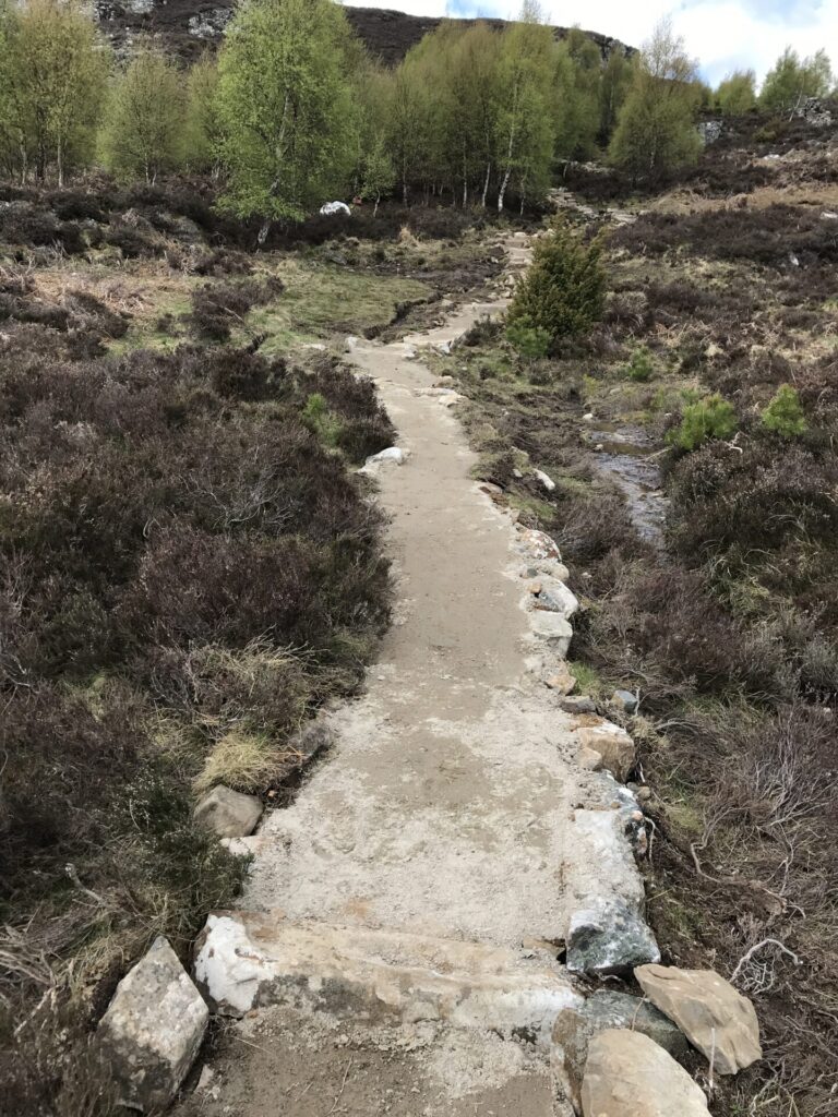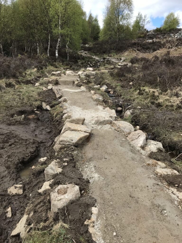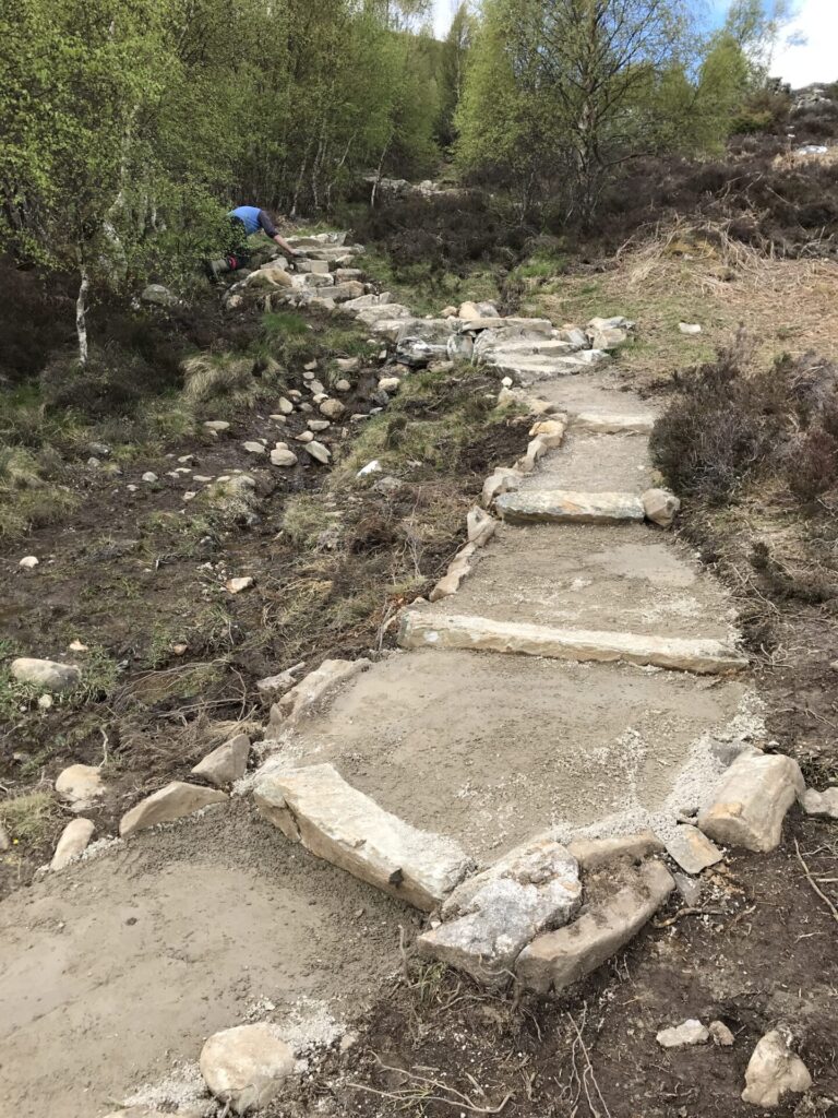 The major task was to transport surfacing material from the “drop” at Tait’s Brae up to the site – no mean feat! This meant bagging the material into sacks, loading the sacks into the power barrow, “driving” the barrow up to the top of the track and thereafter manhandling each sack up the path to where it was needed. As ever, we are grateful for the many willing volunteers and were also helped by a number of Rural Skills students from Kingussie High School.