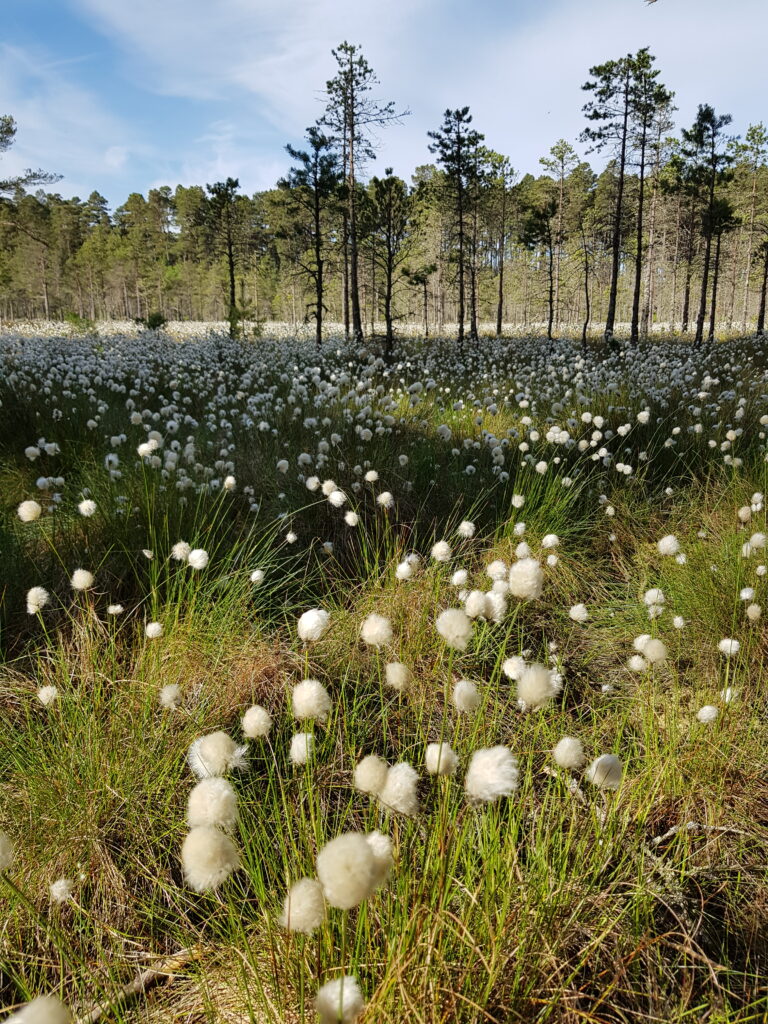 Pines and bog cotton at Drumguish